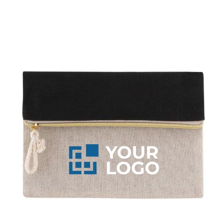 Trousse en coton et jute double face avec fermeture éclair dorée