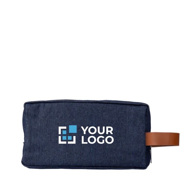 Trousse de toilette en jean élégante avec poignée latérale pratique.
