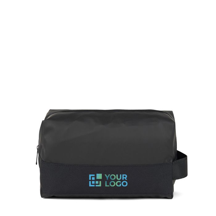Trousse de toilette minimaliste en polyester recyclé, pratique et élégante.