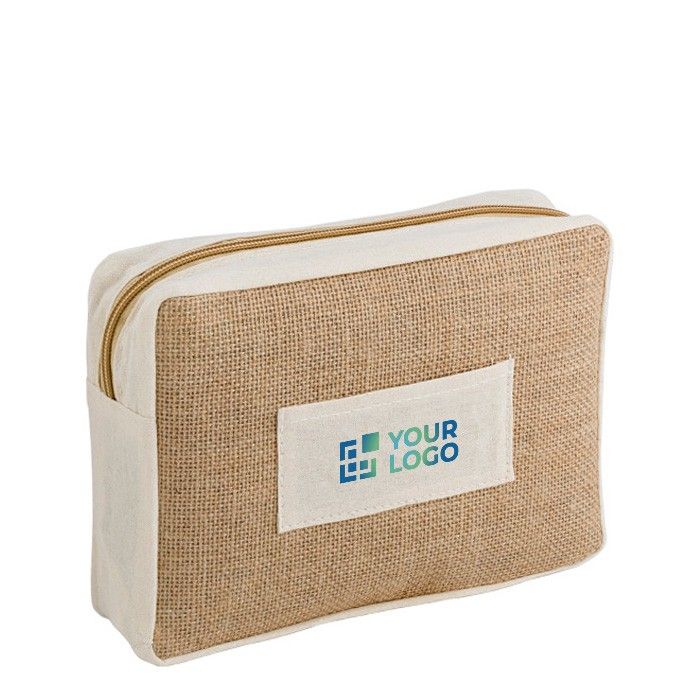 Trousse de toilette éco-responsable en jute et coton personnalisable.