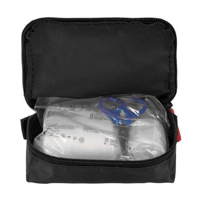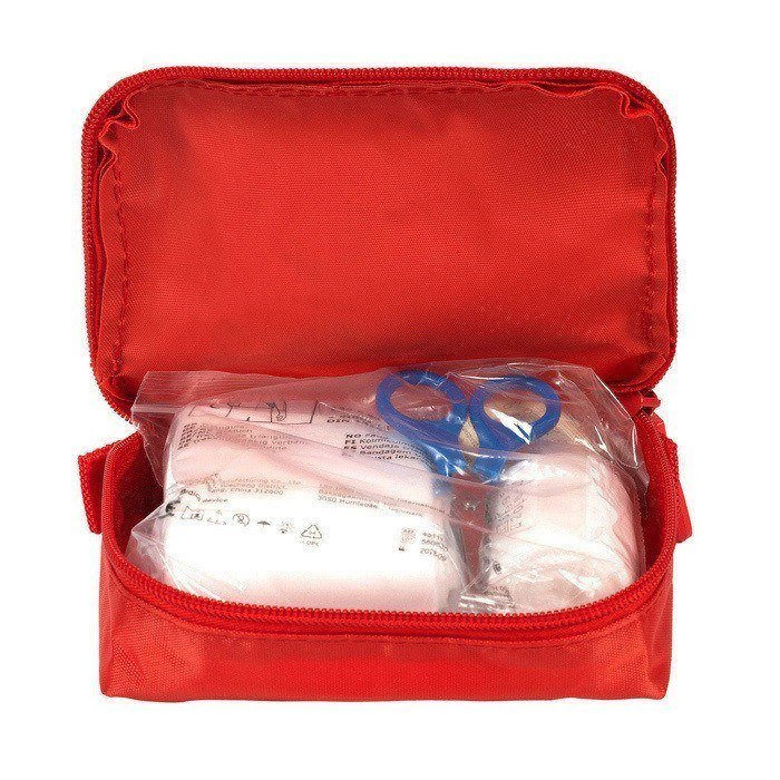 Trousse de premiers secours de 2e classe, dans un étui en nylon ; contient 31 pièces avec une durée de vie de 5 ans : 9 pansements, 8 épingles de sûreté, 5 cotons secs, 4 cotons nettoyants, 1 bandage triangulaire, 1 petite paire de ciseaux, 1 bandage élastique, 1 sparadrap et 1 manuel d’instructions.