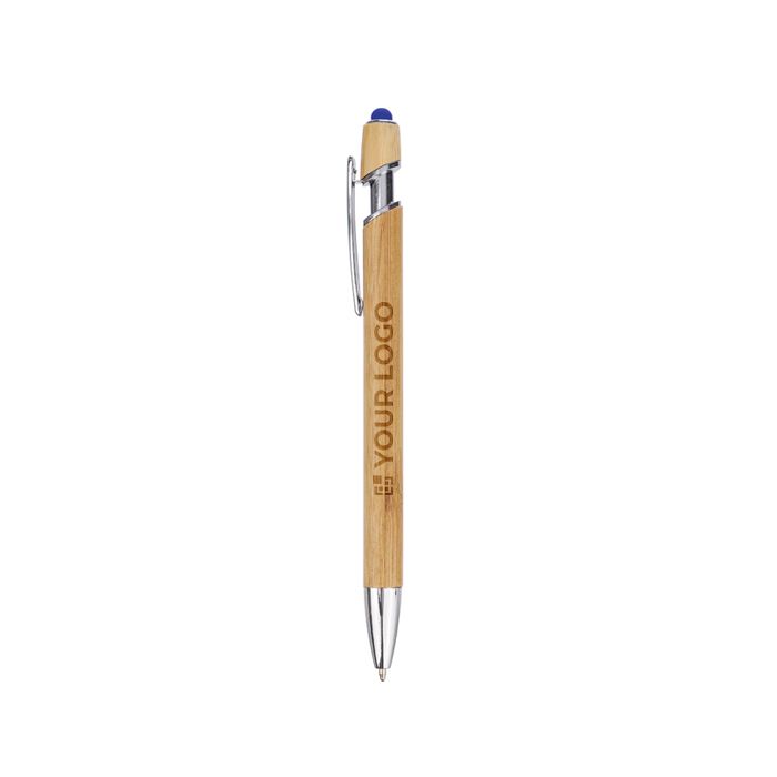 Stylo en bambou élégant avec pointeur tactile et encre bleue.
