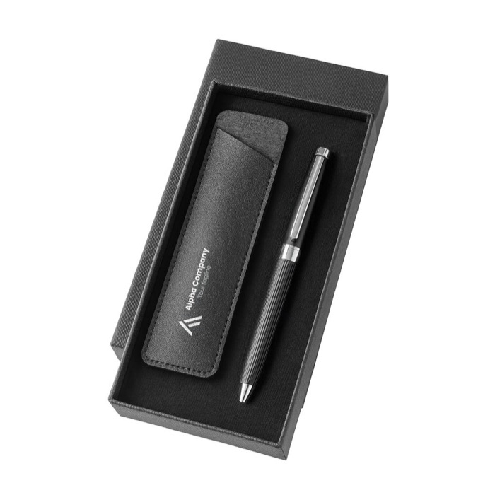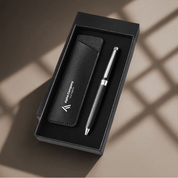 Un stylo métallique à mécanisme rotatif, accompagné d'un élégant étui en cuir synthétique assorti, représente un cadeau d'entreprise distingué. L'encre bleue assure une écriture fluide et professionnelle, adaptée aux signatures ou aux notes importantes. La présentation sophistiquée de ce set dans une boîte cadeau renforce la perception de valeur et d'attention aux détails. Offrir cet ensemble de qualité supérieure permet de marquer les esprits de vos clients et partenaires. Il projette une image de marque raffinée et sérieuse, favorisant des relations commerciales durables et mémorables.
