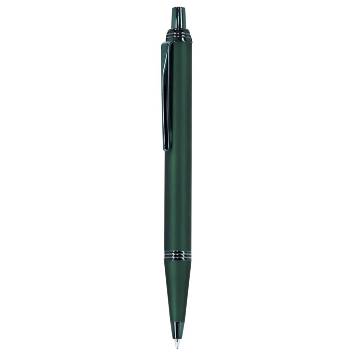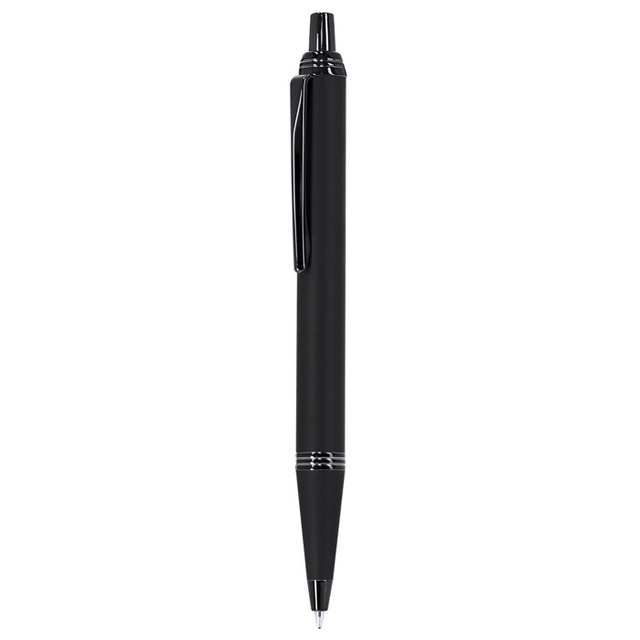 Stylo en aluminium avec finition gomme et détails chromés. Mécanisme à bouton poussoir, cartouche jumbo, encre bleue.