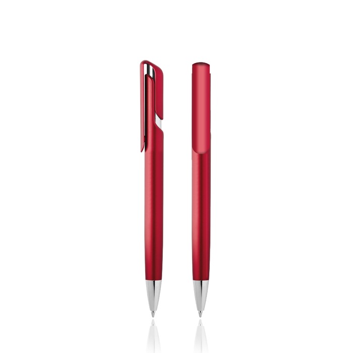 Stylo en plastique métallisé. Écriture bleue avec système à bouton-poussoir. Corps coloré avec détails argentés. Clip large, idéal pour gravure.