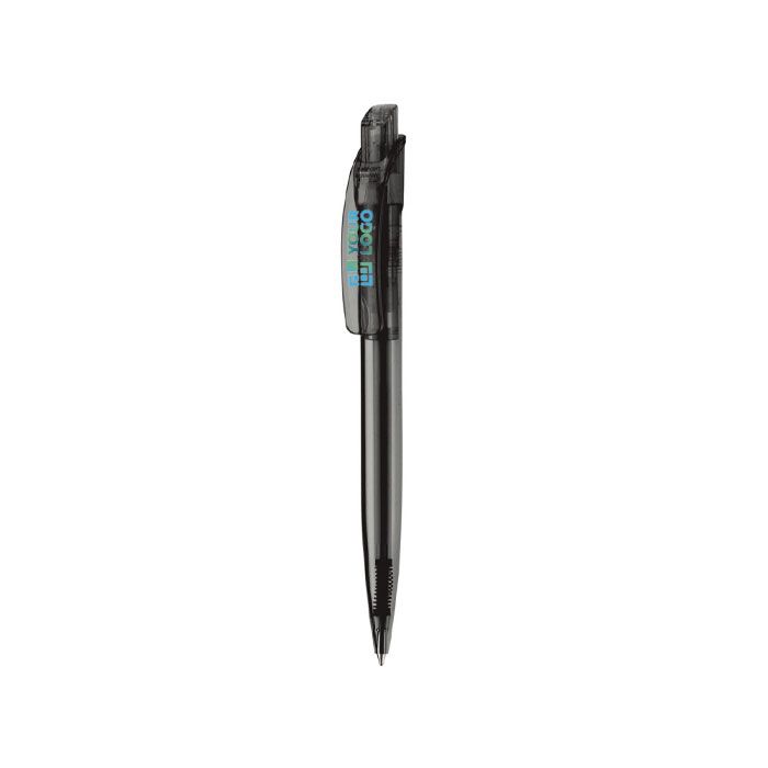 Stylo transparent avec clip carré, fabriqué en Europe, pratique.