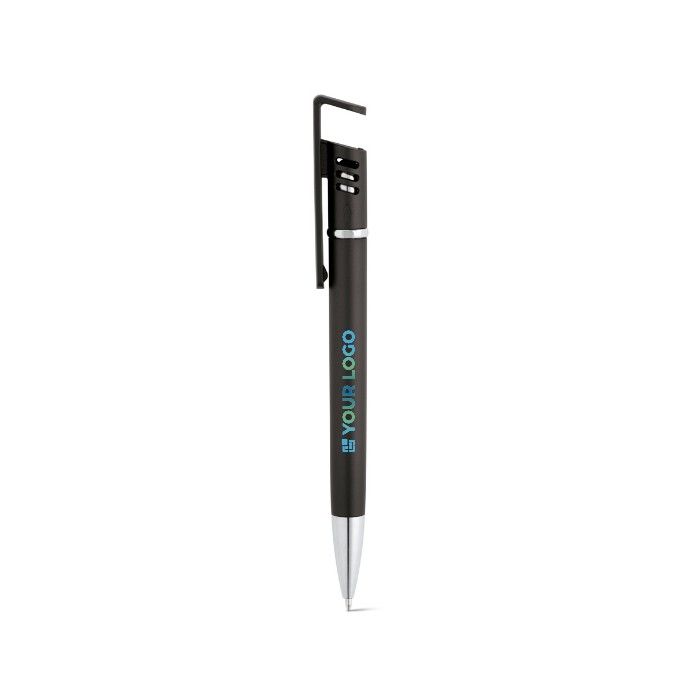 - Stylo avec finition métallique et support intégré pour smartphone.