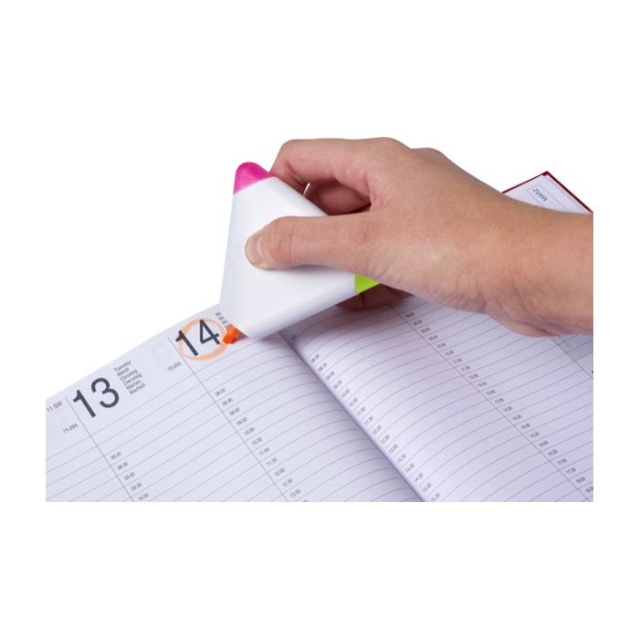 Ce marqueur triangulaire est pratique et attrayant. Il a trois couleurs fluorescentes : jaune, fuchsia et orange, chacune à une extrémité. Parfait pour souligner, organiser des notes ou mettre en évidence des informations importantes. Son boîtier est en plastique ABS, un matériau durable. Facile à transporter dans le sac à dos ou la trousse. C'est un cadeau promotionnel utile et différent, idéal pour des événements, foires ou campagnes publicitaires. Disponible en blanc. Vous pouvez le personnaliser avec votre logo en couleur. Besoin de votre achat en moins de jours ? Il est disponible avec service express !