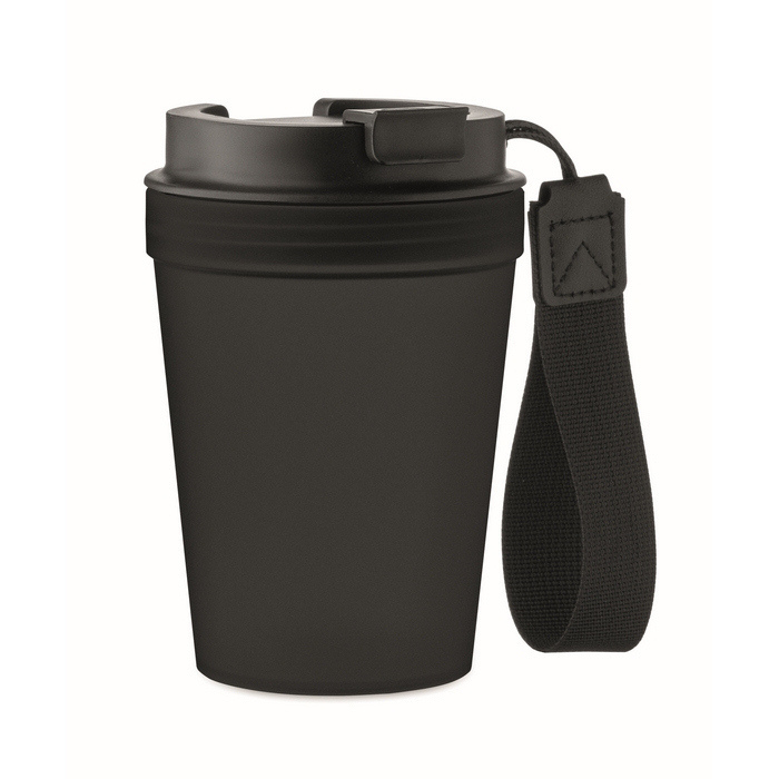 Gobelet à simple paroi en PP avec sangle en polyester RPET. Étanche. Capacité : 300 ml. Le transfert thermique est possible du fait de la paroi simple.