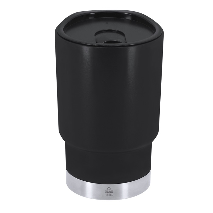 Gobelet isotherme de 380 ml. Fabriqué en PP recyclé à double paroi, base en acier inoxydable recyclé. Couvercle avec doseur facile à ouvrir. Sans BPA. Idéal pour le bureau. Certifié contact alimentaire (Food Grade).