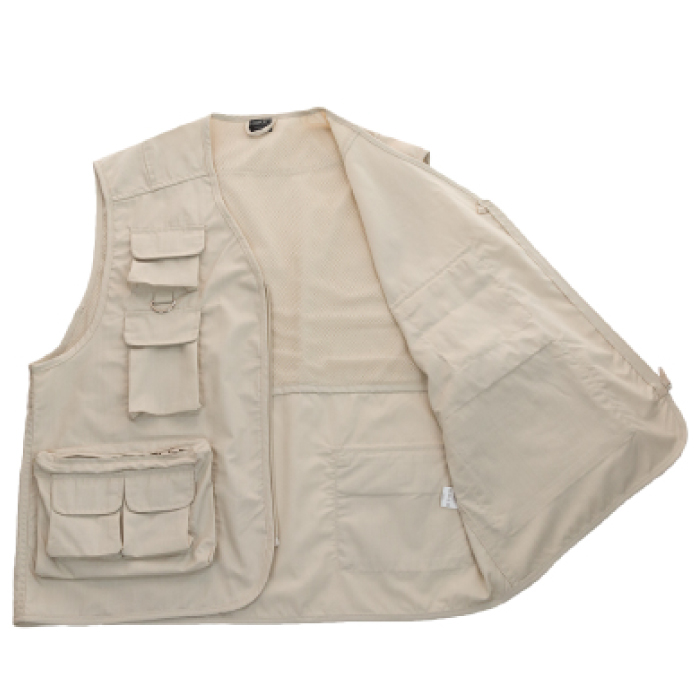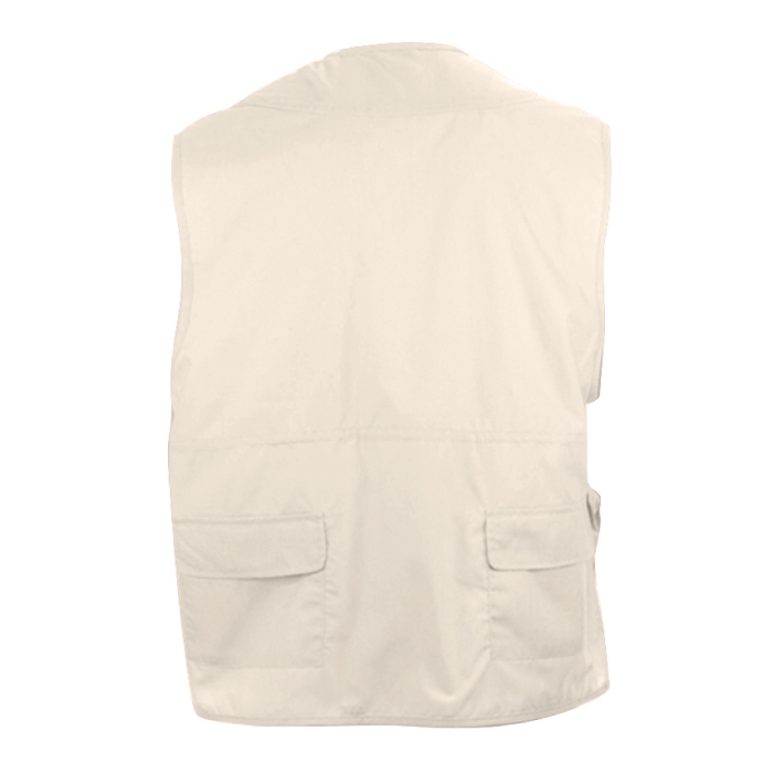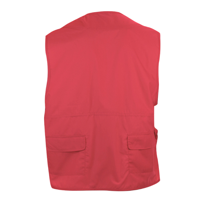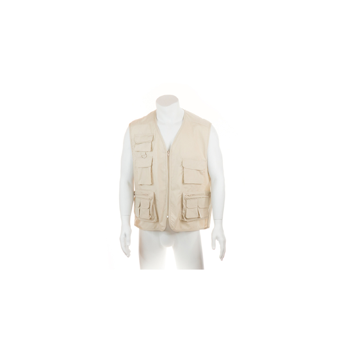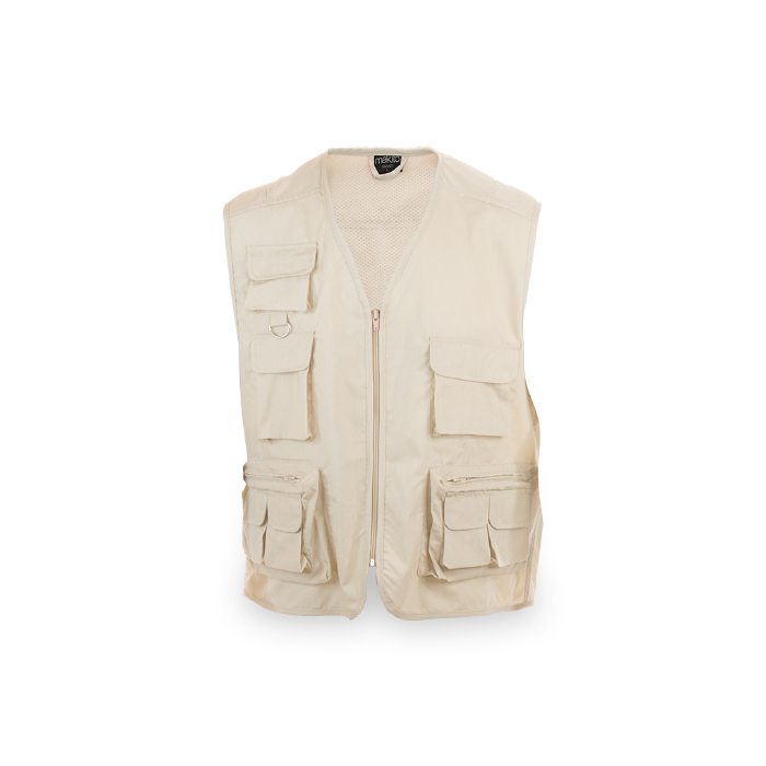 Gilet sans manches en mélange de coton et polyester résistant. Coloris variés. Fermeture principale à zip, nombreuses poches sur le devant et les côtés et anneau métallique sur la partie supérieure du devant. Poches de grande contenance avec fermeture velcro. 35% Coton/ 65% Polyester.