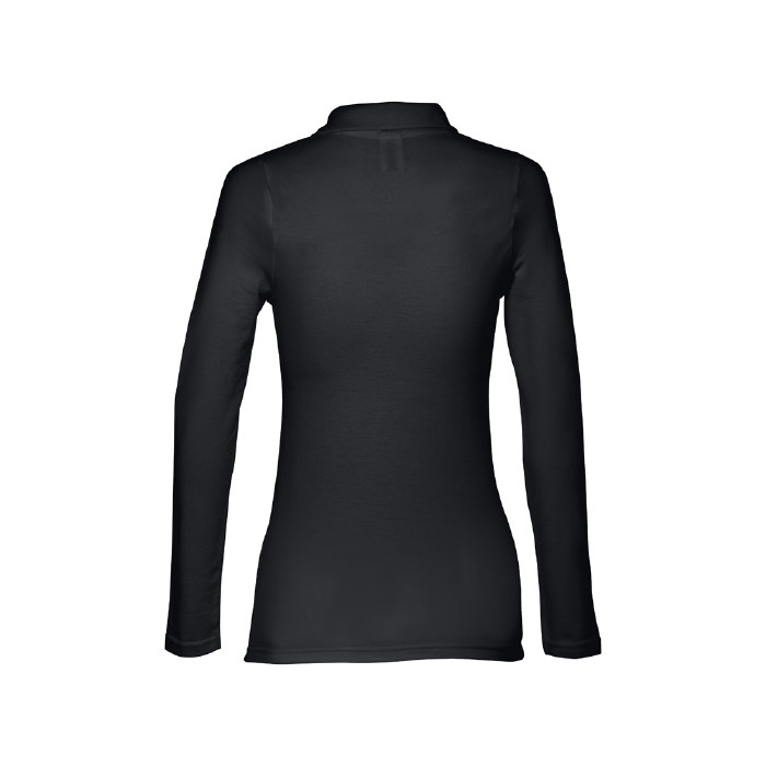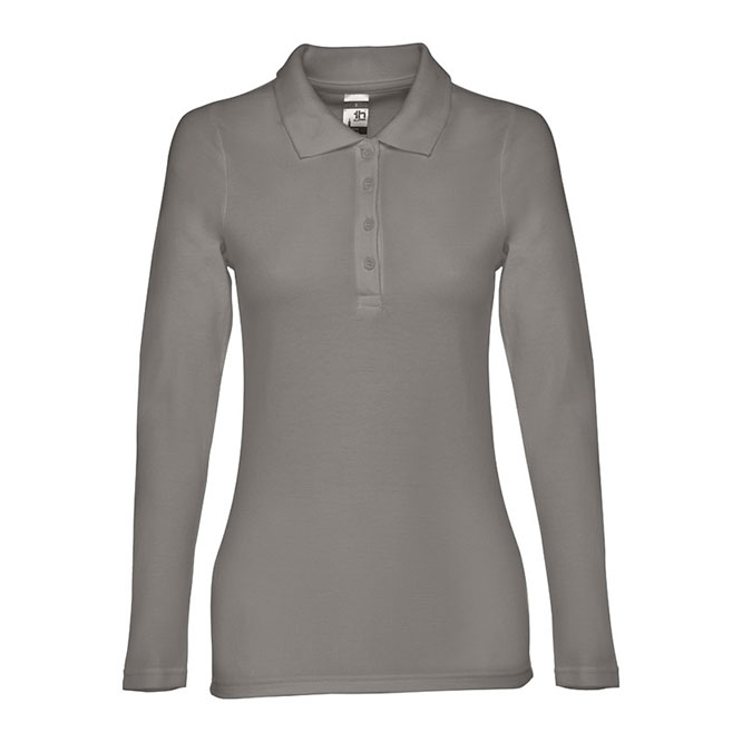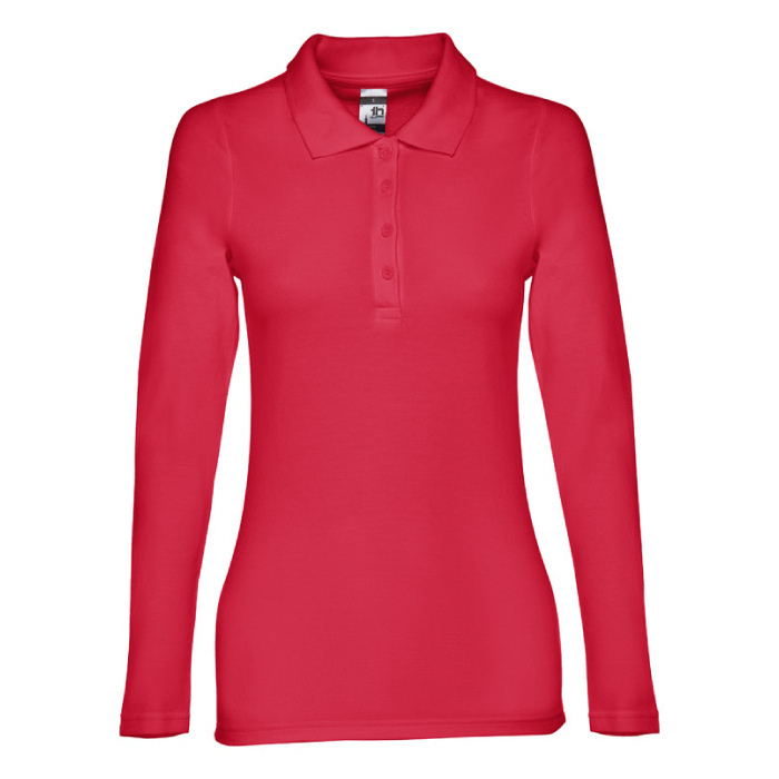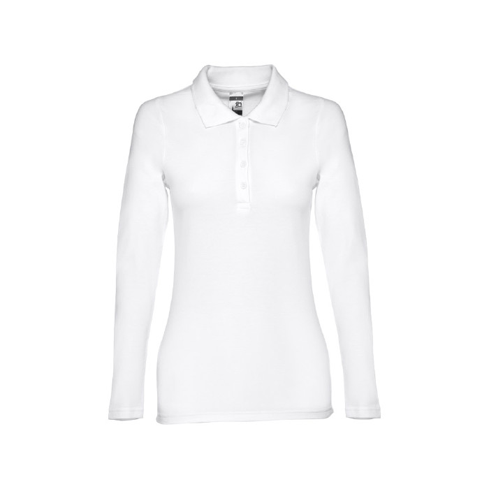 Polo manches longues pour femme, en piqué 100% coton (210 g/m²). Col côtelé renforcé de ruban piqué. Patte de boutonnage renforcée avec 4 boutons colorés (bouton de rechange inséré dans la couture intérieure). Pièce coupée et cousue avec manches à double couture.