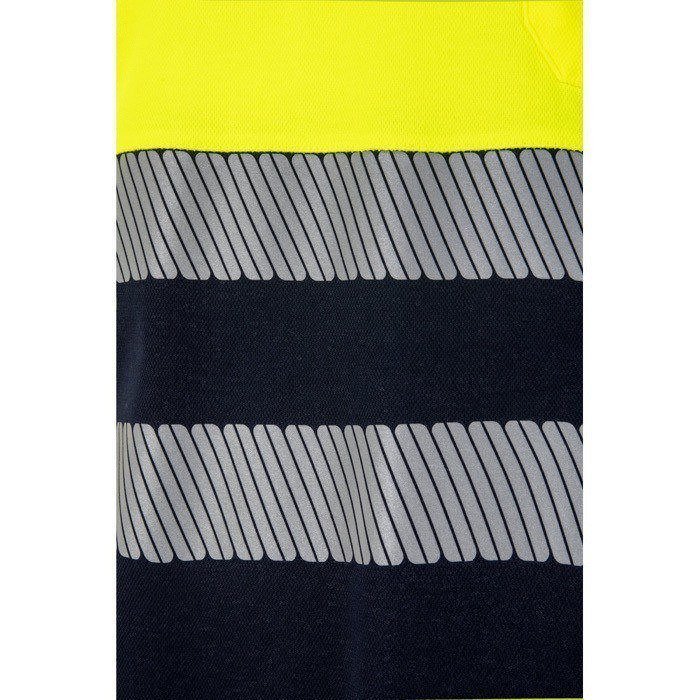 Polo en piqué bicolore (150g/m²) à manches courtes, en coton (55%) et polyester (45%). Boutons, col et bas côtelés de couleur contrastée. Bandes réfléchissantes segmentées sur le torse. Comprend une poche poitrine.