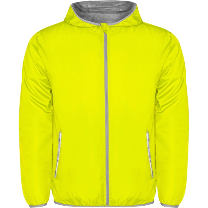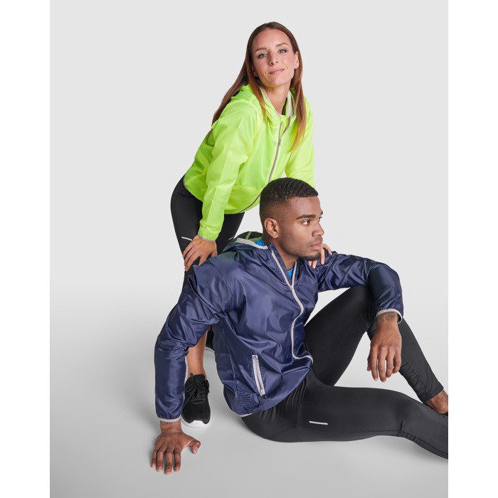 Coupe-vent avec capuche, fermeture éclair complète contrastée avec protège-menton et curseur. Comprend poches avant avec liseré réfléchissant et poche kangourou à l’arrière pour ranger le vêtement, fermeture velcro. Manches et bas avec liseré élastique contrasté. Intérieur de la capuche en mesh et coutures couvertes.