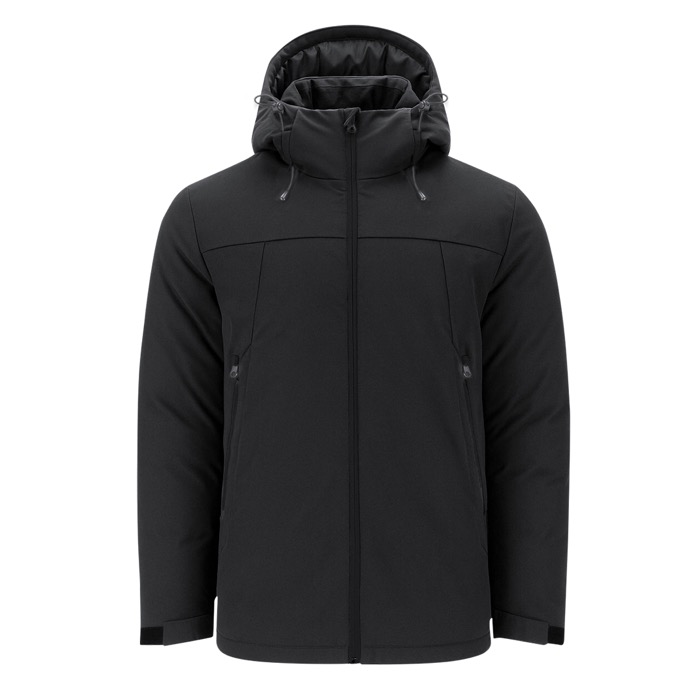 Parka unisexe matelassée avec capuche fixe ajustable. Fermeture zippée noire avec protège-menton pour plus de confort et protection. Deux poches latérales zippées noires. Poignets ajustables par velcro.
